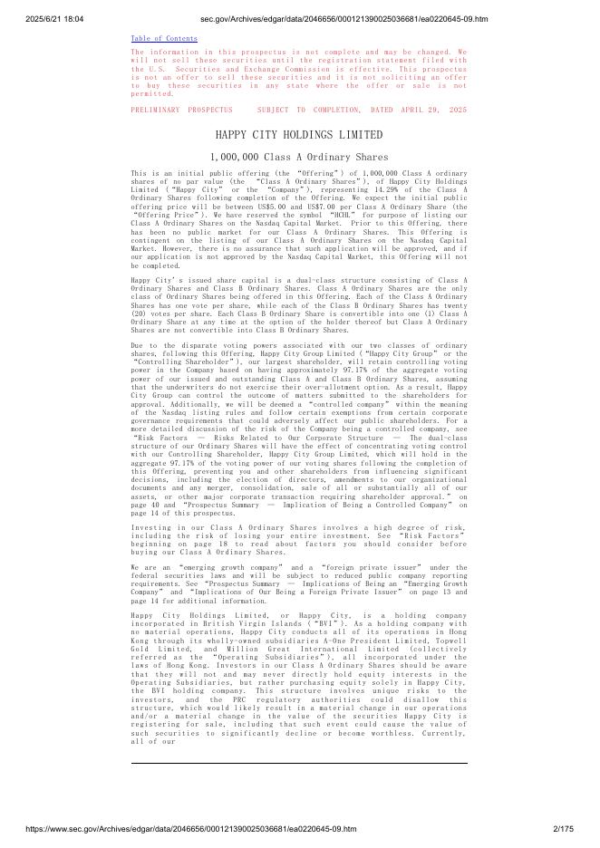 Happy City Holdings Limited美股纳斯达克IPO上市招股说明书.pdf