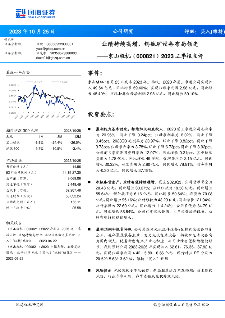 国海证券:京山轻机(000821)-2023三季报点评:业绩持续高增,钙钛矿设备布局领先.pdf