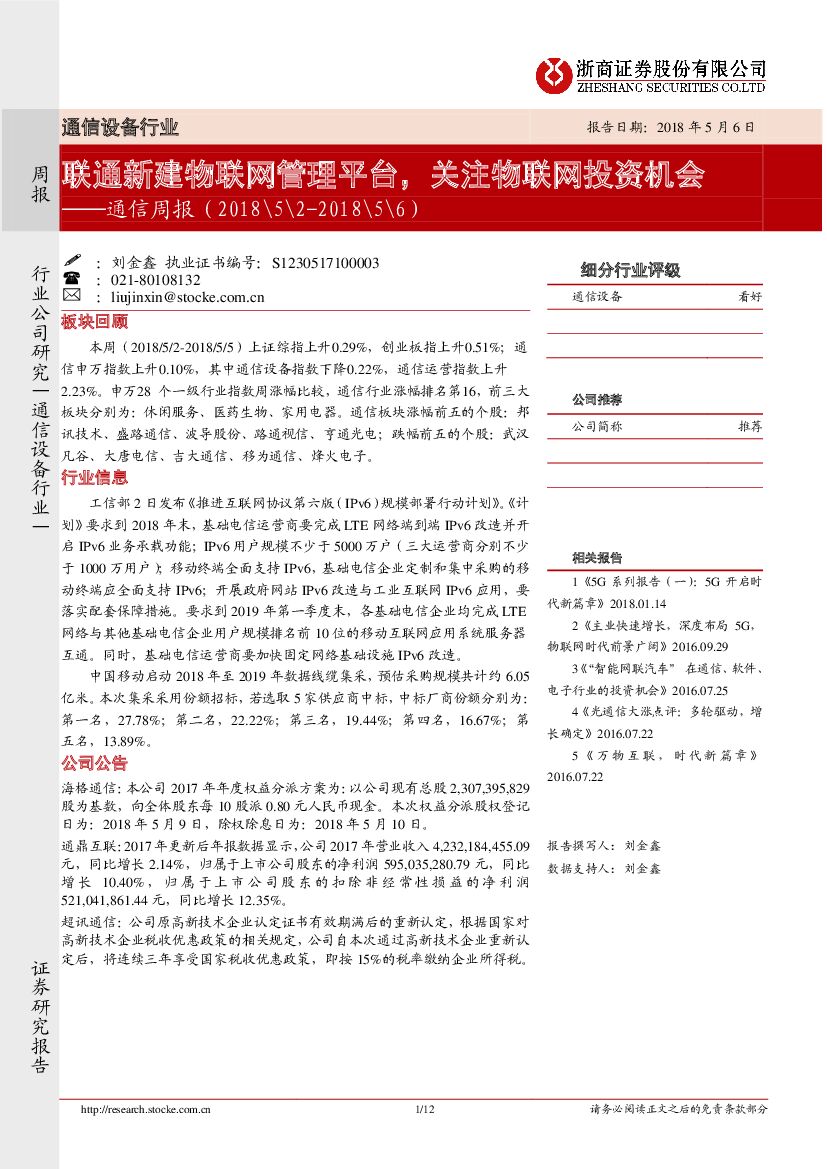 浙商证券:通信周报:联通新建物联网管理平台,关注物联网投资机会.pdf