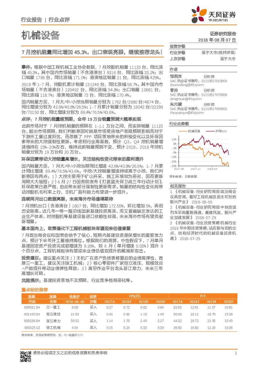 天风证券:机械设备行业点评:7月挖机销量同比增加45.3%,出口表现亮眼,继续推荐龙头!.pdf