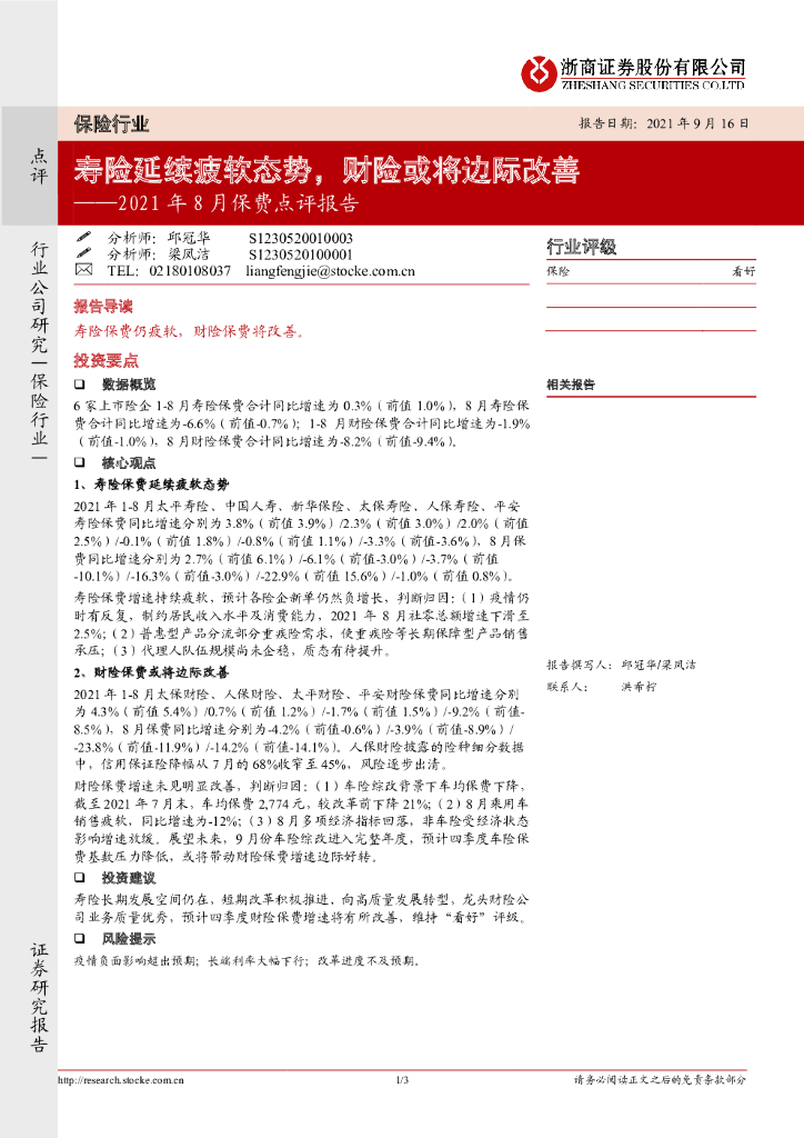 浙商证券:2021年8月保费点评报告:寿险延续疲软态势,财险或将边际改善.pdf