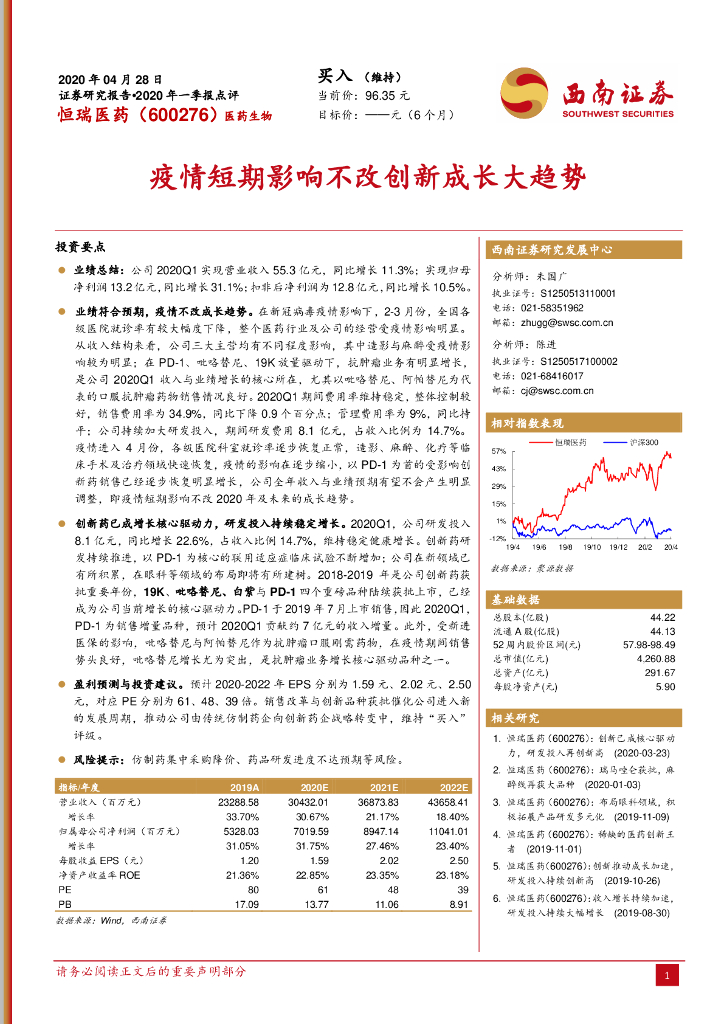 西南证券:恒瑞医药(600276)-疫情短期影响不改创新成长大趋势.pdf