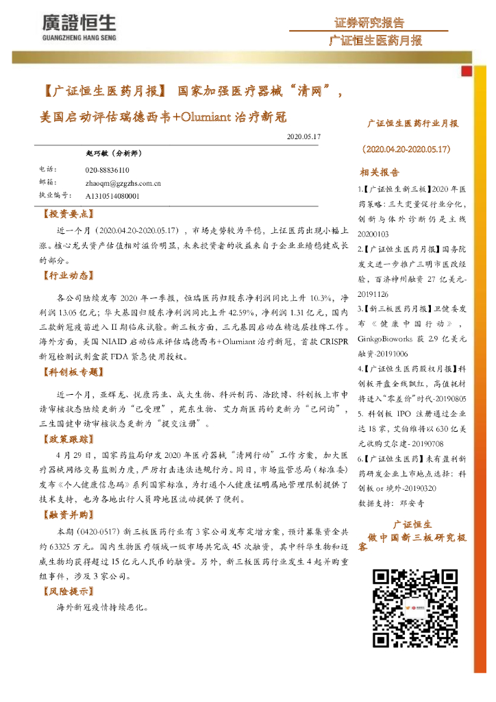 广证恒生证券研究所:【广证恒生医药月报】国家加强医疗器械“清网”,美国启动评估瑞德西韦+Olumiant治疗新冠.pdf