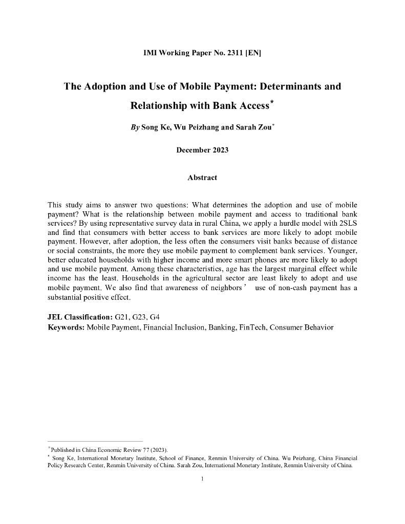 IMI Working Paper No.2311:The Adoption and Use of Mobile Payment Determinants and Relationship with Bank Access.pdf
