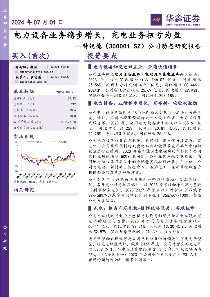 华鑫证券:特锐德(300001)-公司动态研究报告:电力设备业务稳步增长,充电业务扭亏为盈.pdf