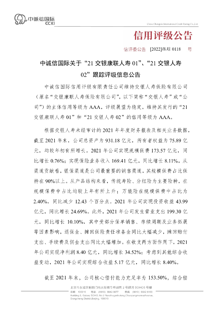 中诚信:中诚信国际关于“21交银康联人寿01”、“21交银人寿02”跟踪评级信息公告.pdf