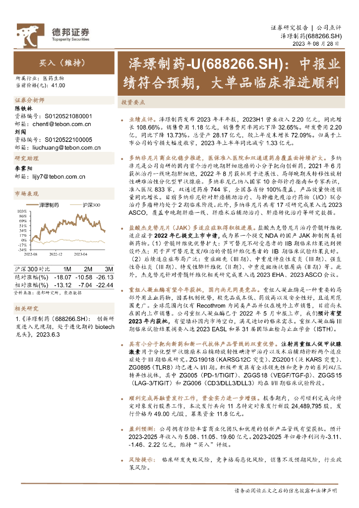 德邦证券:泽璟制药(688266)-中报业绩符合预期,大单品临床推进顺利.pdf