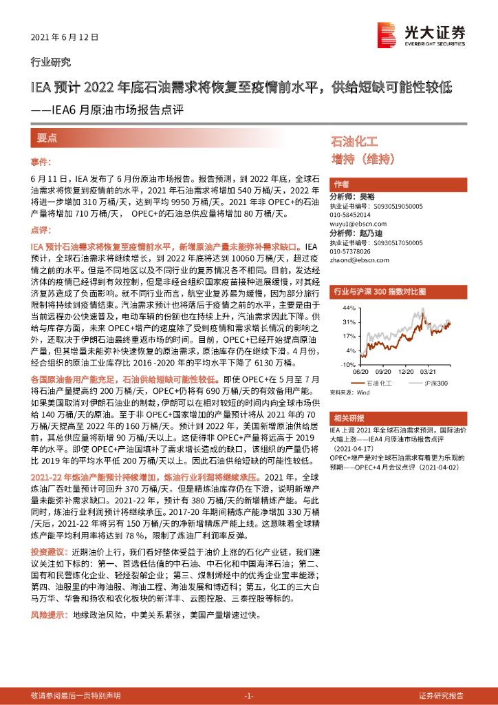 光大证券:IEA6月原油市场报告点评:IEA预计2022年底石油需求将恢复至疫情前水平,供给短缺可能性较低.pdf