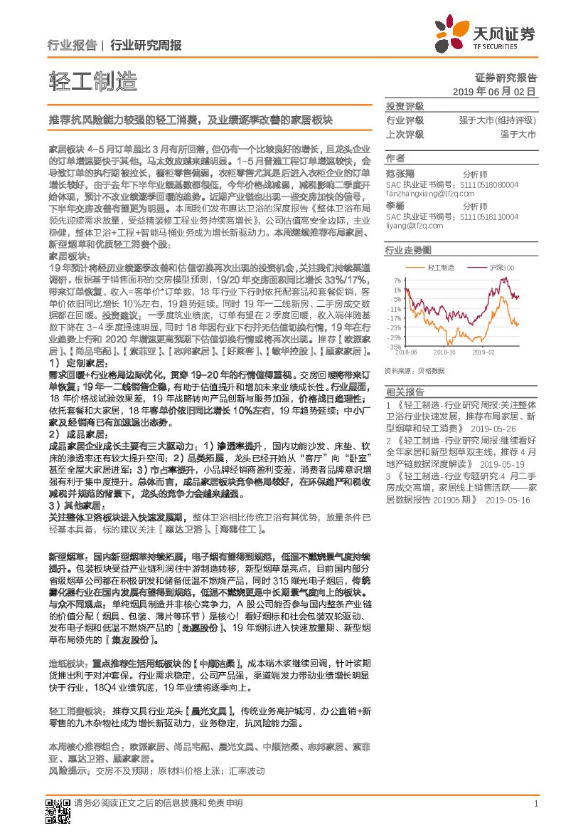 天风证券:轻工制造行业研究周报:推荐抗风险能力较强的轻工消费,及业绩逐季改善的家居板块.pdf