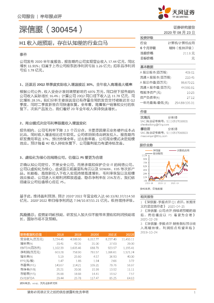 天风证券:深信服(300454)-H1收入超预期,存在认知差的行业白马.pdf