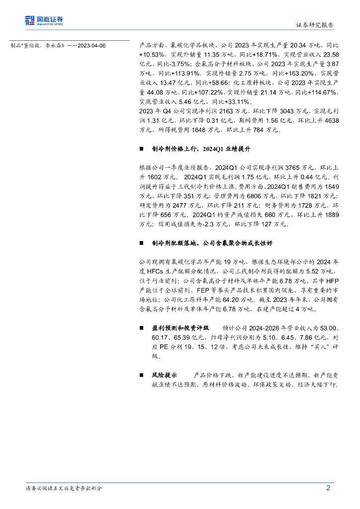 国海证券:永和股份(605020)-2023年年报及2024年一季报点评:制冷剂价格上涨,看好公司含氟聚合物成长性.pdf