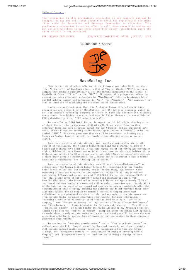 MaxsMaking Inc.美股纳斯达克IPO上市招股说明书.pdf