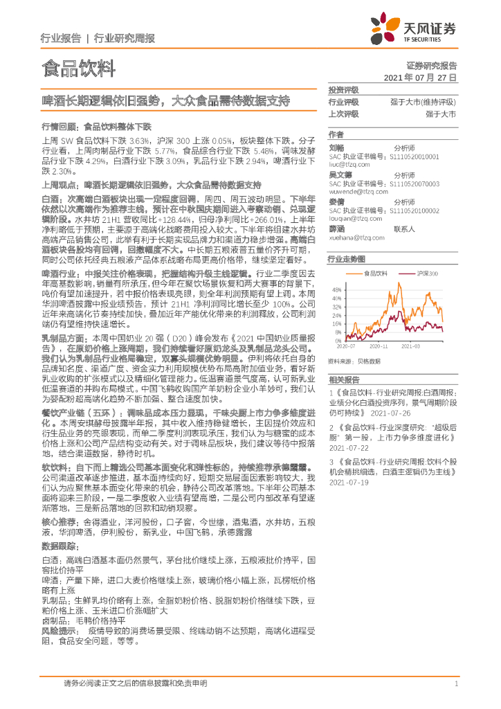 天风证券:食品饮料行业研究周报:啤酒长期逻辑依旧强势,大众食品需待数据支持.pdf
