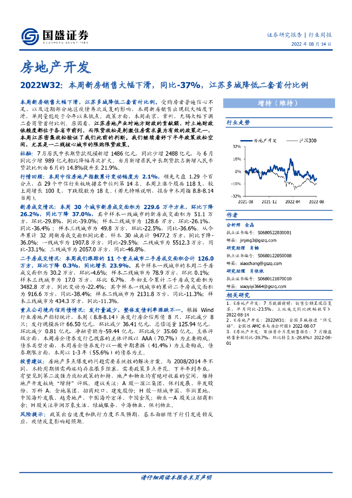 国盛证券:房地产开发2022W32:本周新房销售大幅下滑,同比-37%,江苏多城降低二套首付比例.pdf