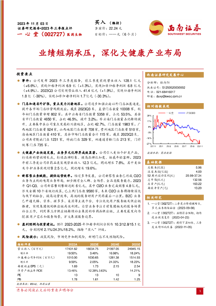 西南证券:一心堂(002727)-2023年三季报点评:业绩短期承压,深化大健康产业布局.pdf