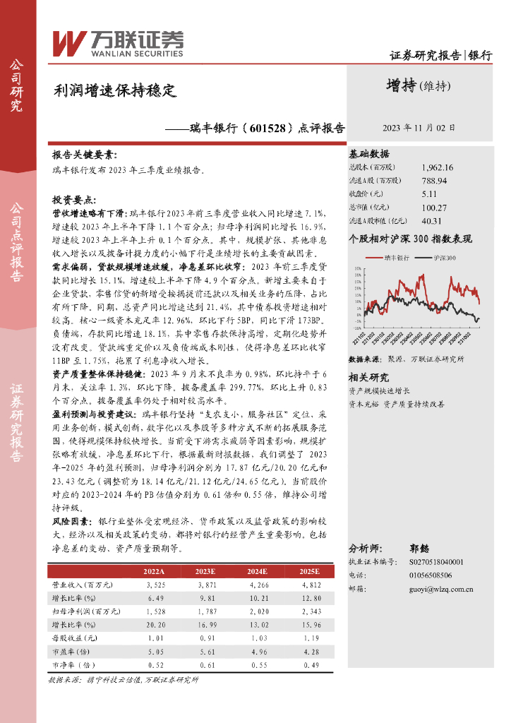 万联证券:瑞丰银行(601528)-点评报告:利润增速保持稳定.pdf