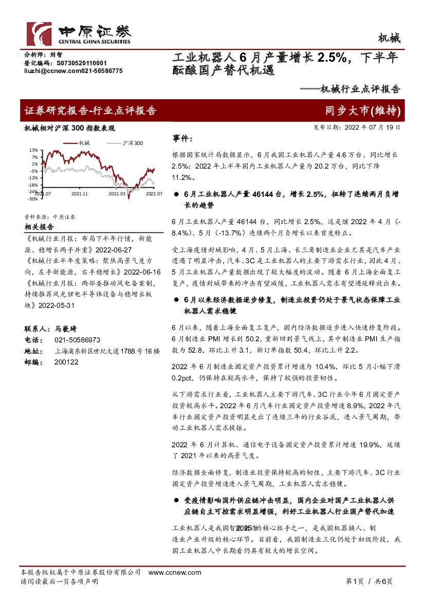 中原证券:机械行业点评报告:工业机器人6月产量增长2.5%,下半年酝酿国产替代机遇.pdf