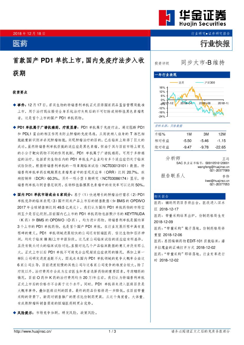 华金证券:医药行业快报:首款国产PD1单抗上市,国内免疫疗法步入收获期.pdf