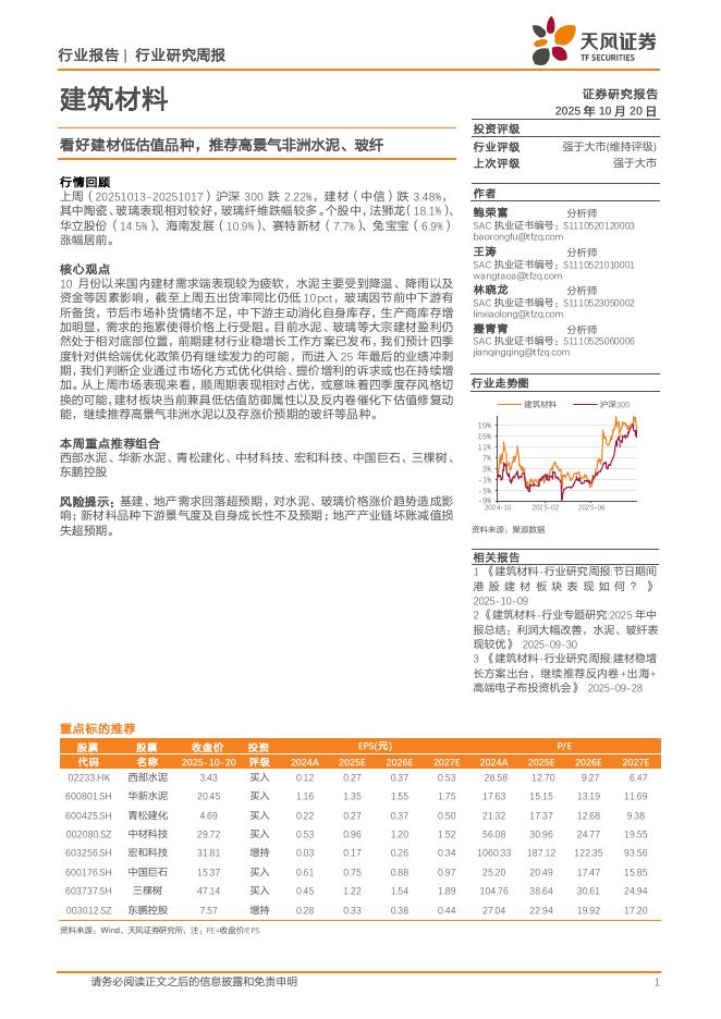 天风证券:建筑材料行业研究周报:看好建材低估值品种,推荐高景气非洲水泥、玻纤.pdf