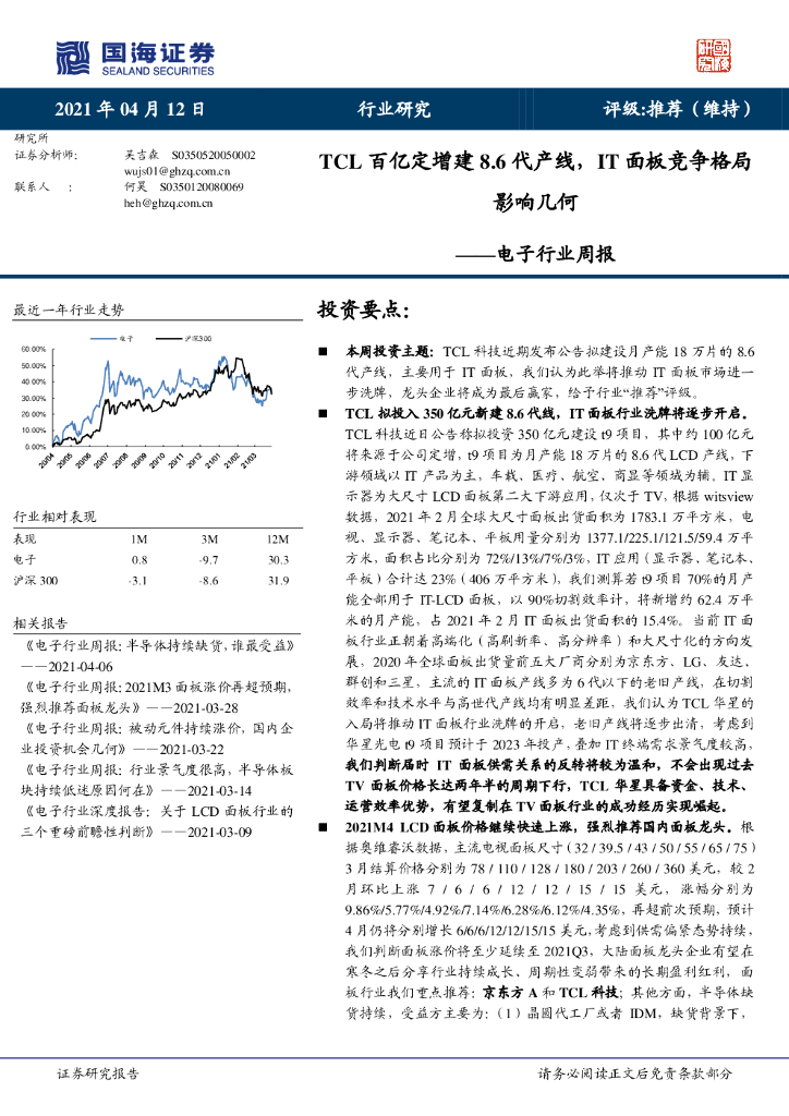 国海证券:电子行业周报:TCL百亿定增建8.6代产线,IT面板竞争格局影响几何.pdf