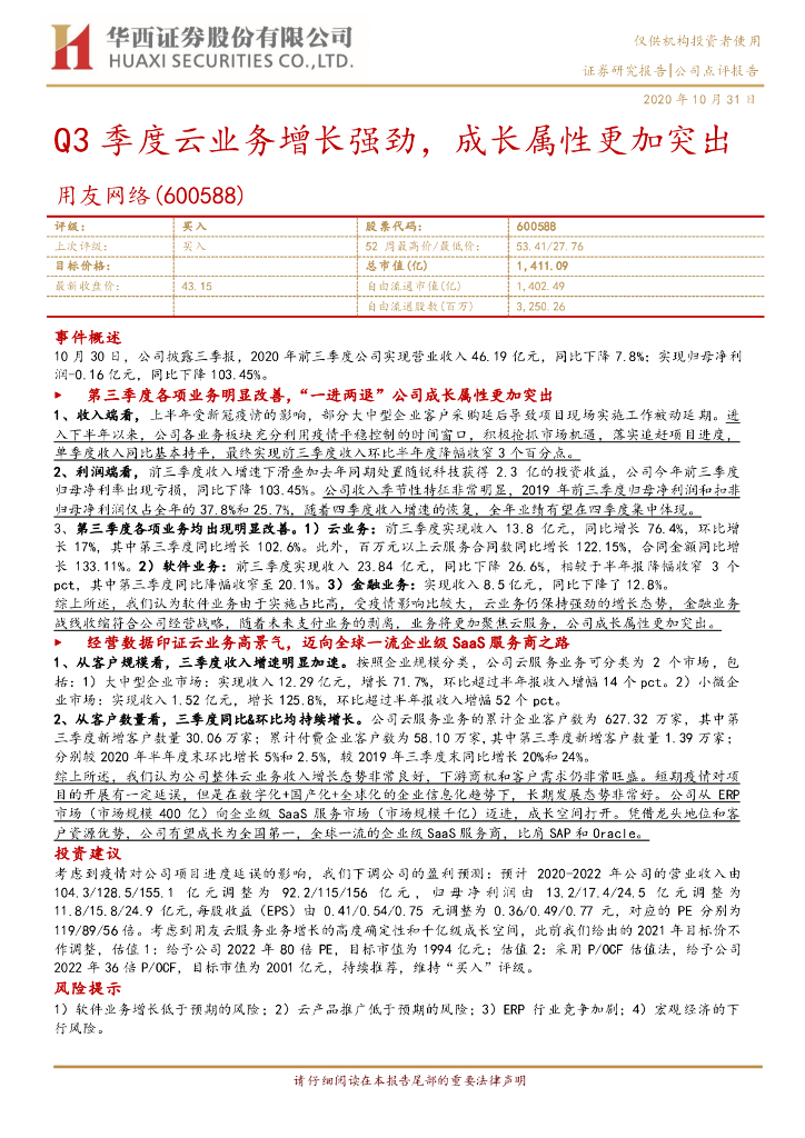 华西证券:用友网络(600588)-Q3季度云业务增长强劲,成长属性更加突出.pdf