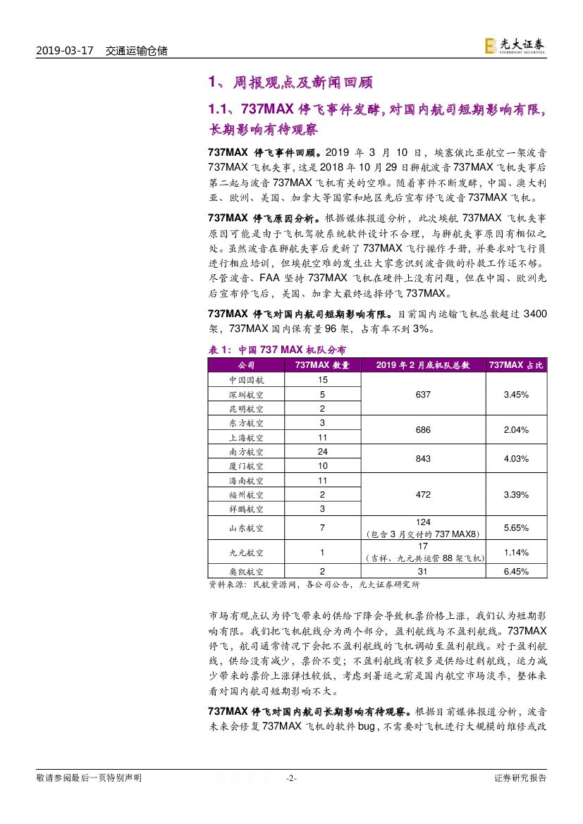 光大证券:交通运输行业周报:737MAX停飞事件发酵,国内航司短期影响有限.pdf