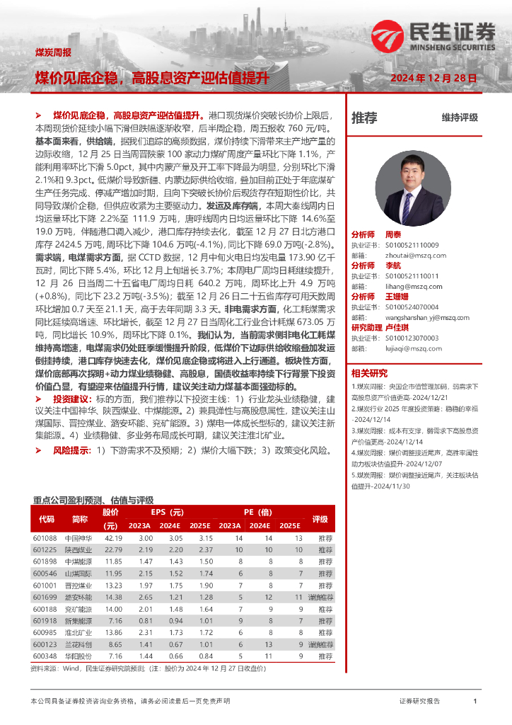 民生证券:煤炭周报:煤价见底企稳,高股息资产迎估值提升.pdf