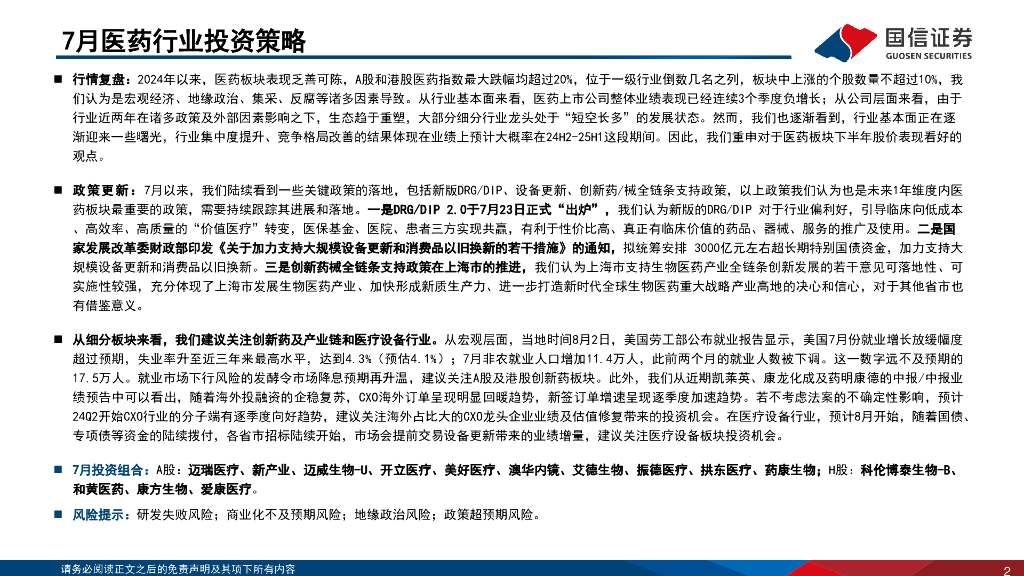 国信证券:医药生物行业2024年7月投资策略:关注中报后板块机会,重点推荐创新药械产业链.pdf