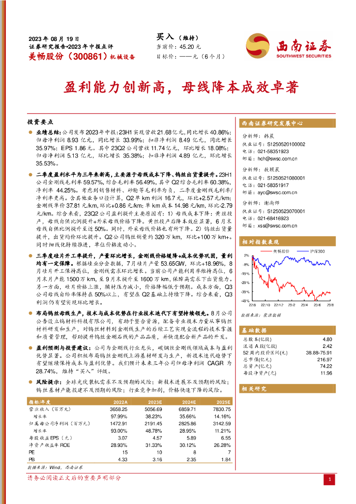 西南证券:美畅股份(300861)-2023年中报点评:盈利能力创新高,母线降本成效卓著.pdf