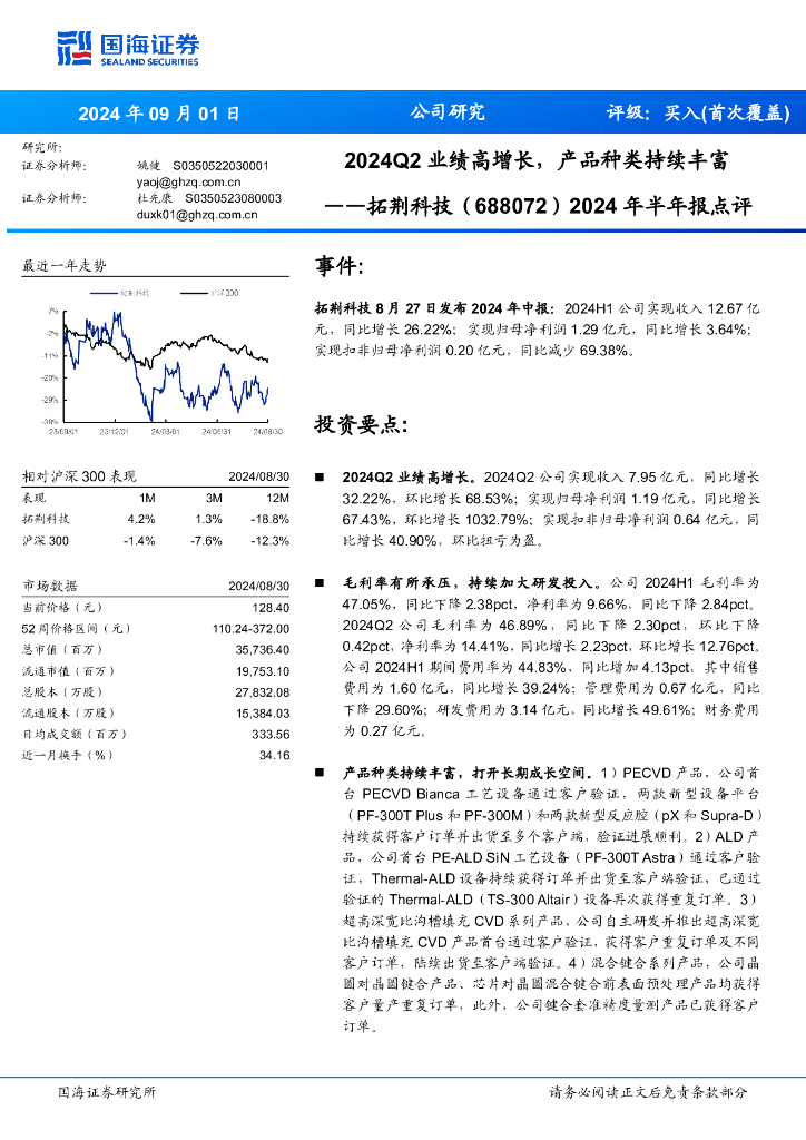 国海证券:拓荆科技(688072)-2024年半年报点评:2024Q2业绩高增长,产品种类持续丰富.pdf