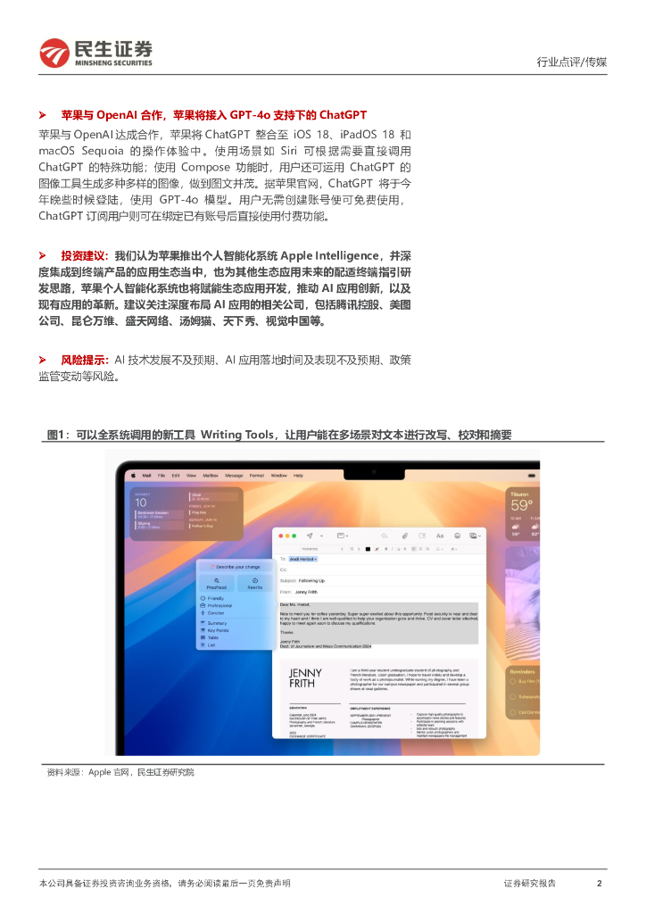 民生证券:传媒行业事件点评:苹果AI正式亮相,AI加持原生应用及Siri.pdf