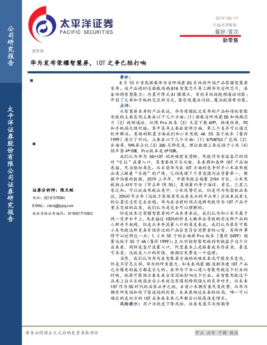 太平洋证券:新零售:华为发布荣耀智慧屏,IOT之争已经打响.pdf