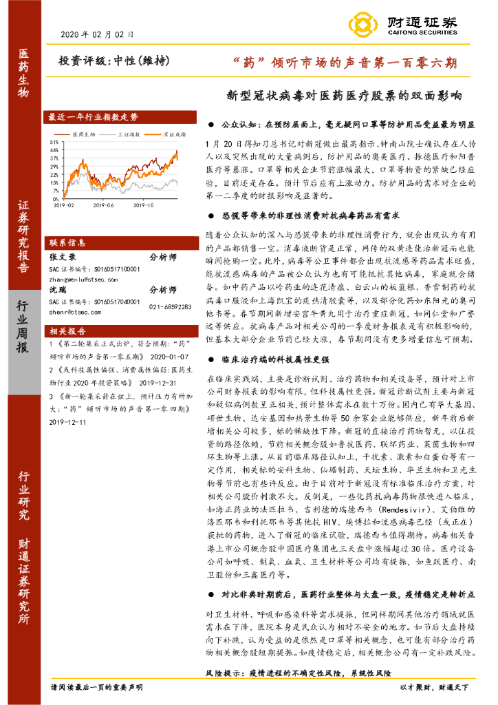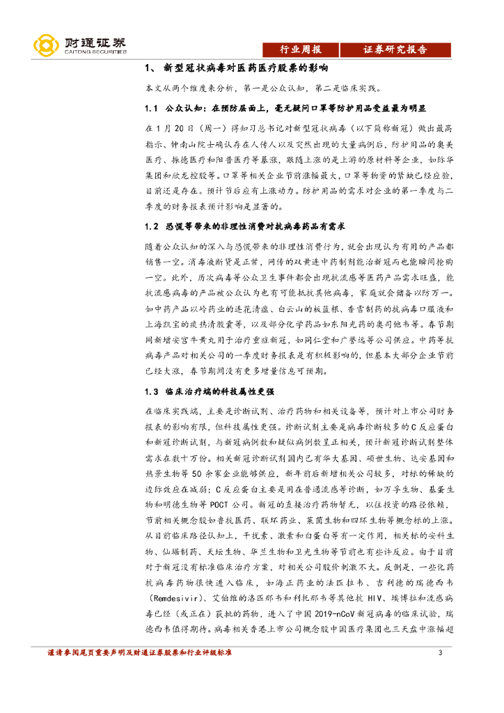 财通证券:“药”倾听市场的声音第一百零六期:新型冠状病毒对医药医疗股票的双面影响.pdf