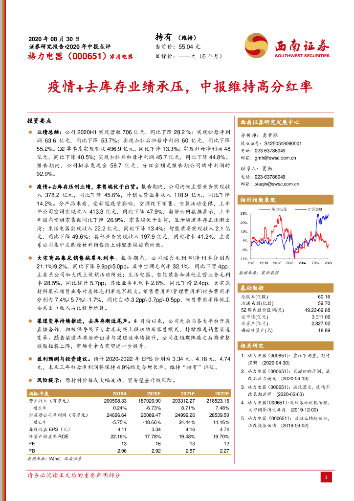 西南证券:格力电器(000651)-疫情+去库存业绩承压,中报维持高分红率.pdf