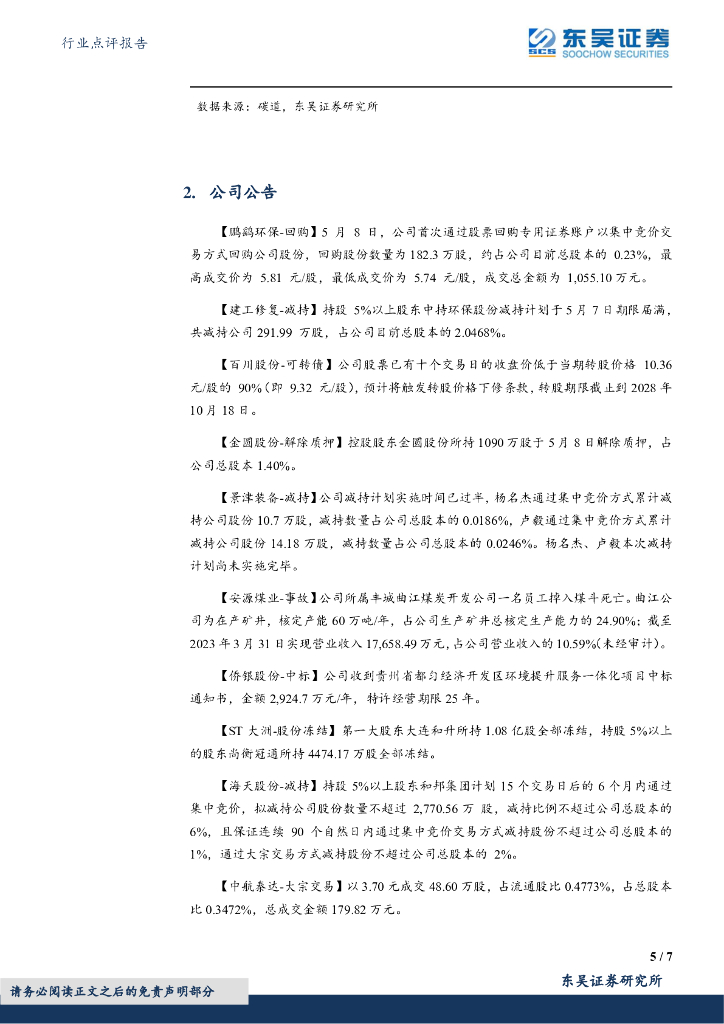 东吴证券:环保行业跟踪周报:【高能环境】受益金属价格上涨,【龙净环保】矿山绿电贡献业绩,重视水固红利价值