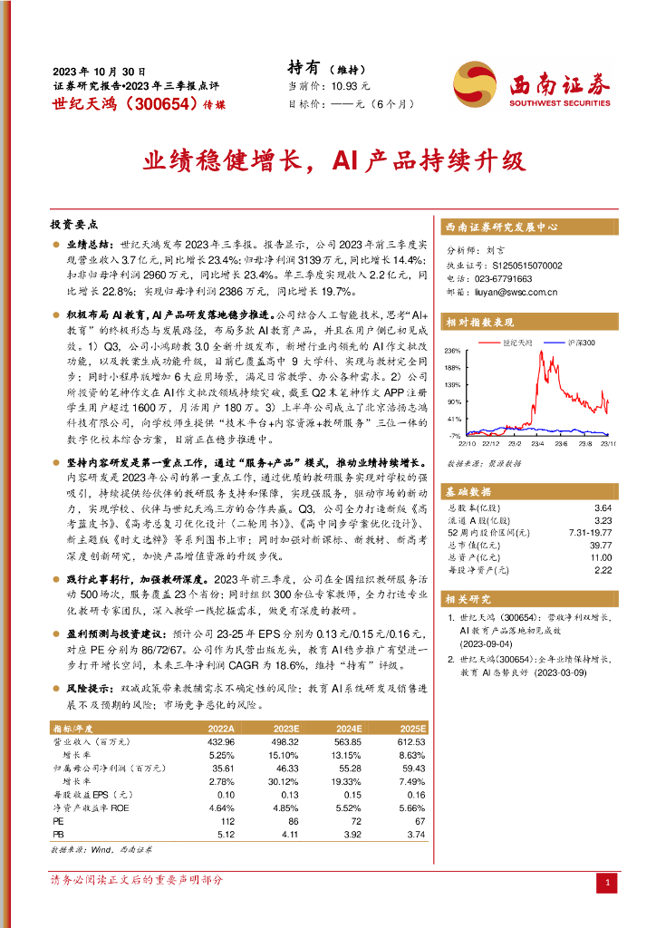 西南证券:世纪天鸿(300654)-2023年三季报点评:业绩稳健增长,AI产品持续升级.pdf