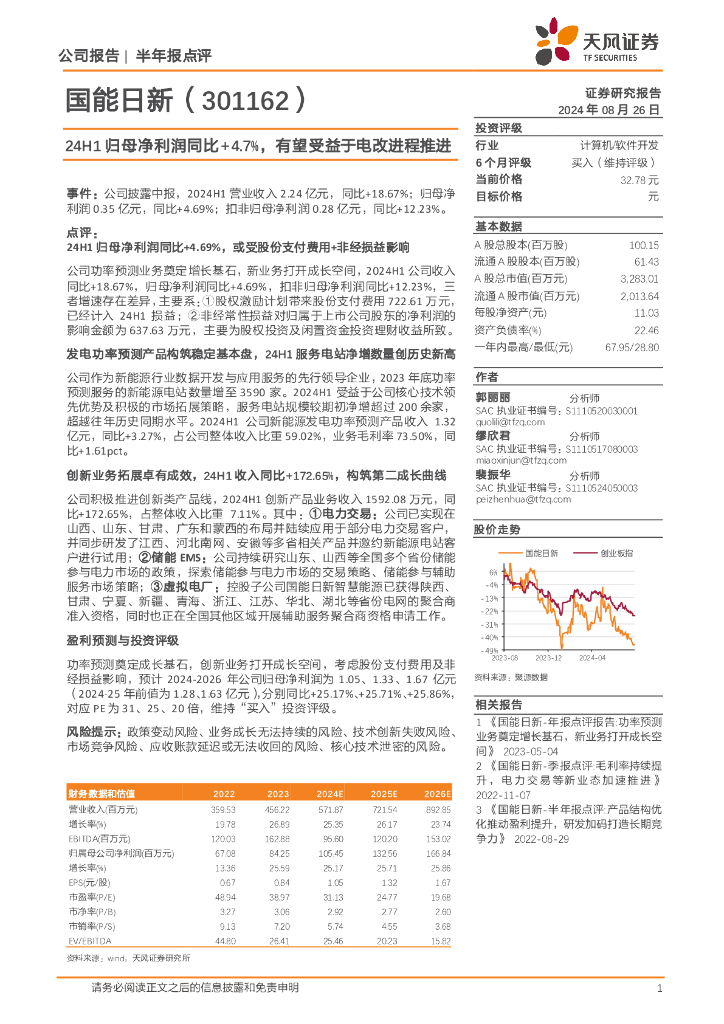 天风证券:国能日新(301162)-24H1归母净利润同比+4.7%,有望受益于电改进程推进.pdf
