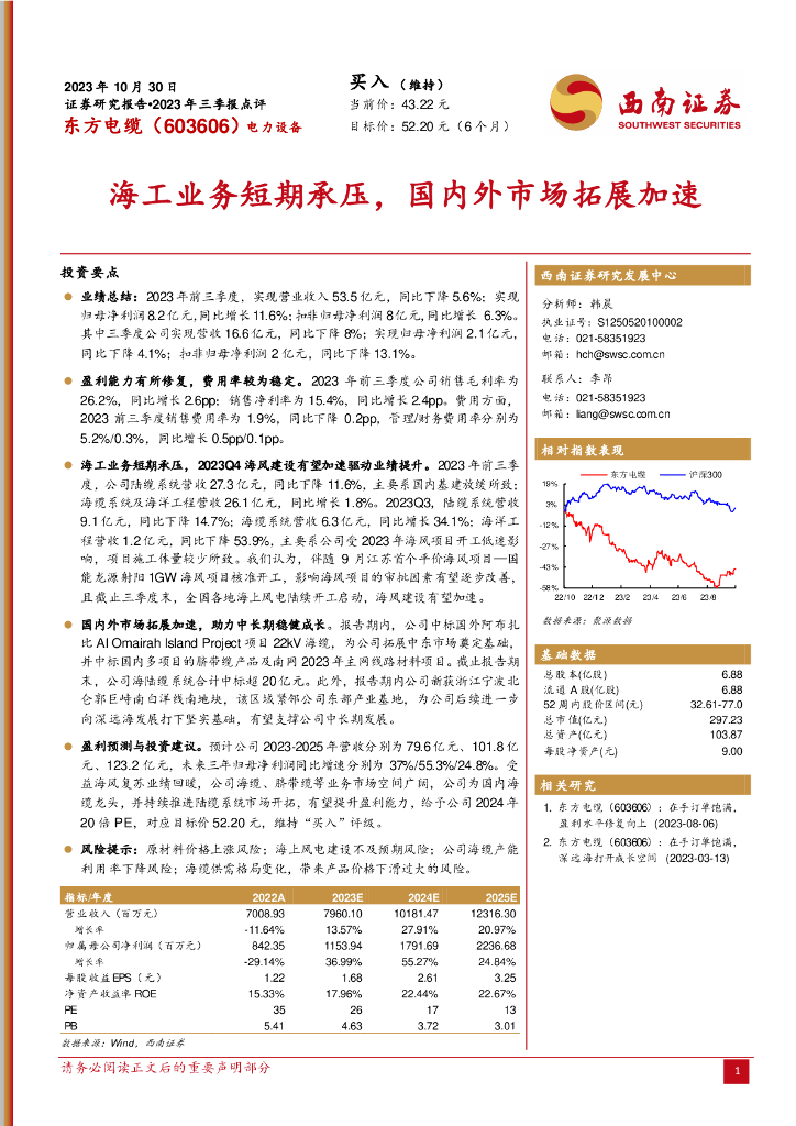 西南证券:东方电缆(603606)-2023年三季报点评:海工业务短期承压,国内外市场拓展加速.pdf