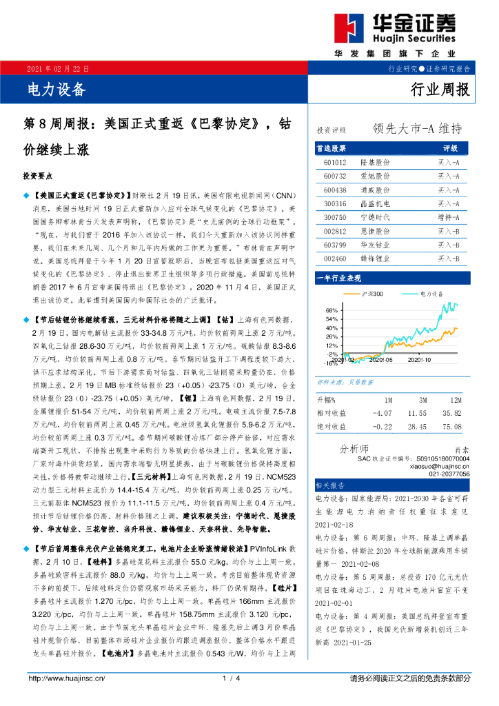 华金证券:电力设备第8周周报:美国正式重返《巴黎协定》,钴价继续上涨.pdf