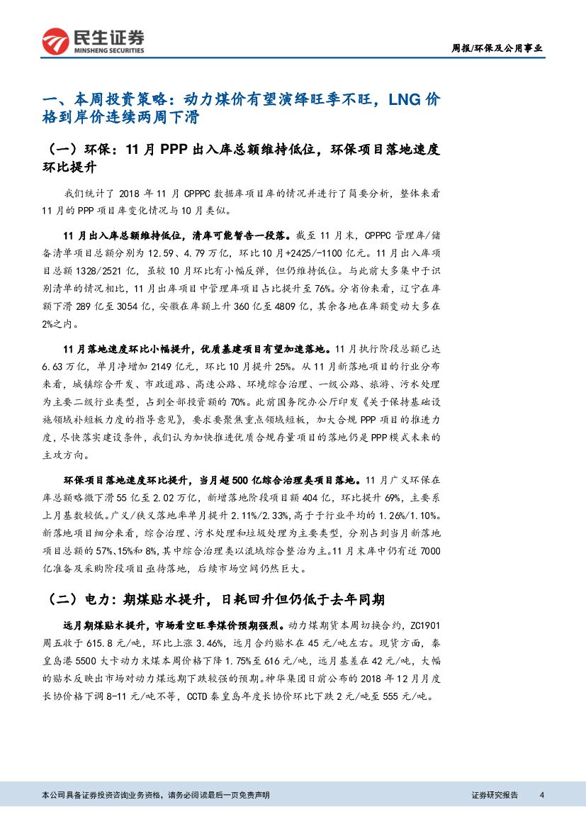 民生证券:环保及公用事业行业研究周报:动力煤价有望演绎旺季不旺,LNG价格到岸价连续两周下滑.pdf
