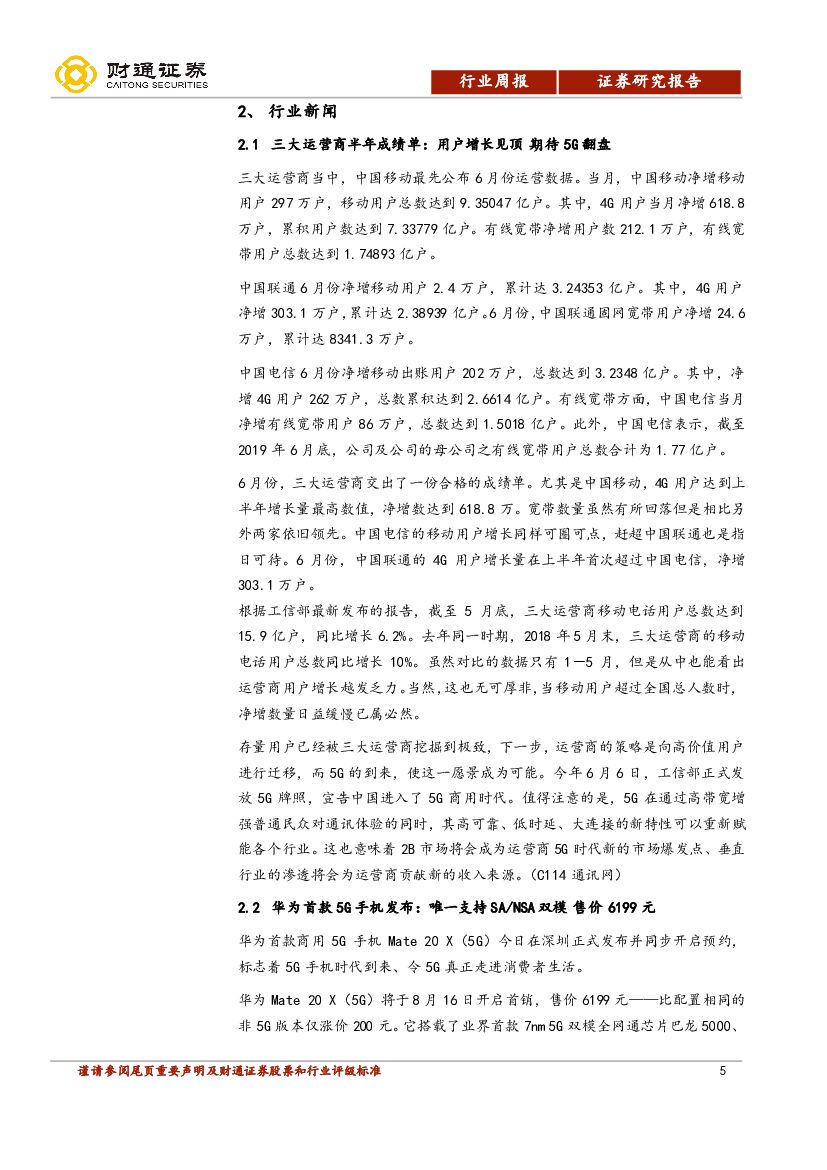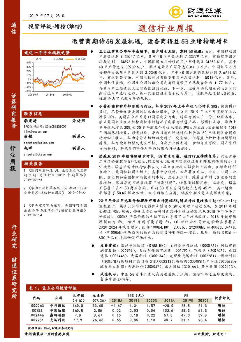 财通证券:通信行业周报:运营商期待5G发展机遇,设备商得益5G业绩持续增长.pdf