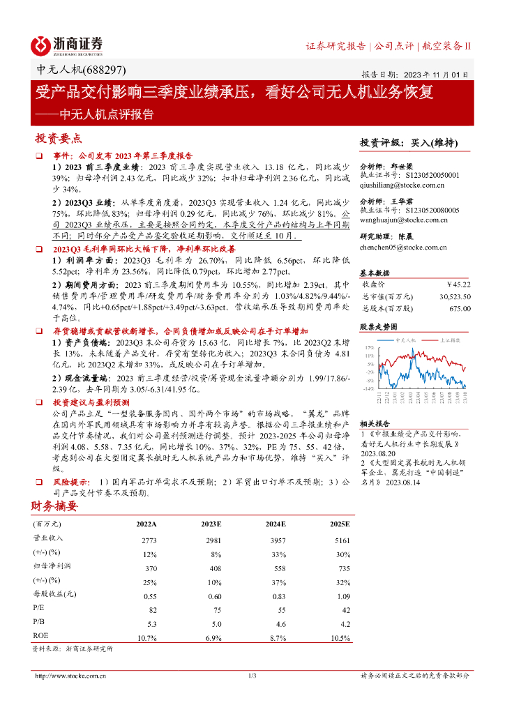 浙商证券:中无人机点评报告:受产品交付影响三季度业绩承压,看好公司无人机业务恢复.pdf