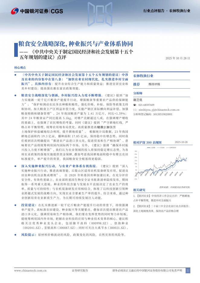 中国银河:农林牧渔行业行业点评报告:《中共中央关于制定国民经济和社会发展第十五个五年规划的建议》点评-粮食安全战略深化,种业振兴与产业体系协同.pdf