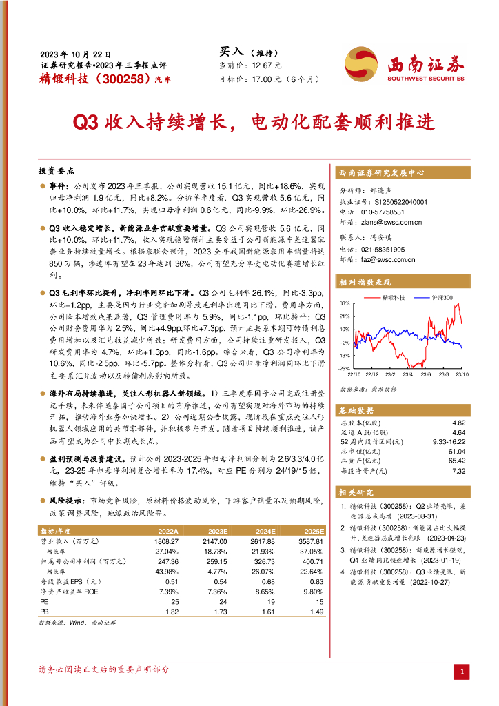 西南证券:精锻科技(300258)-2023年三季报点评:Q3收入持续增长,电动化配套顺利推进.pdf