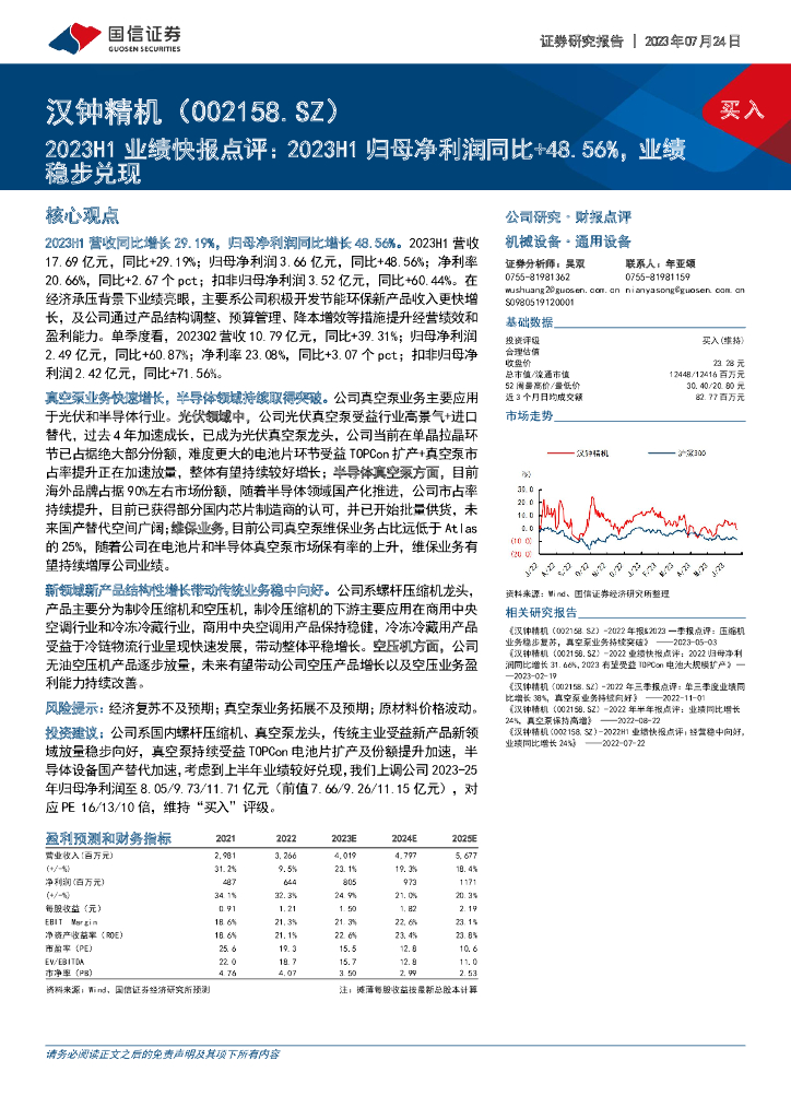 国信证券:汉钟精机(002158)-2023H1业绩快报点评:2023H1归母净利润同比+48.56%,业绩稳步兑现.pdf