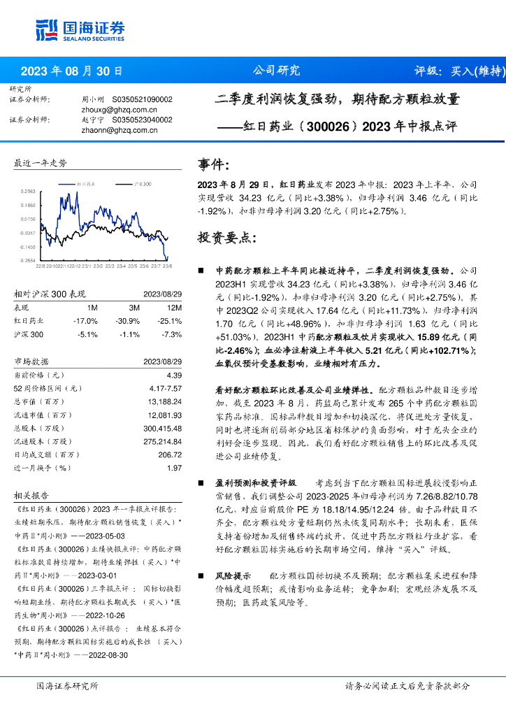 国海证券:红日药业(300026)-2023年中报点评:二季度利润恢复强劲,期待配方颗粒放量.pdf