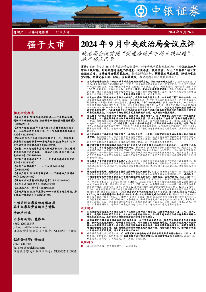 中银证券:房地产行业2024年9月中央政治局会议点评:政治局会议首提“促进房地产市场止跌回稳”,地产拐点已至.pdf