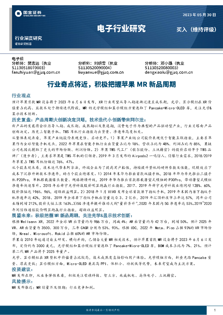 国金证券:电子行业深度研究:行业奇点将近,积极把握苹果MR新品周期.pdf