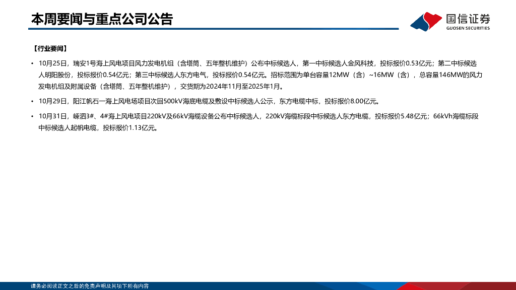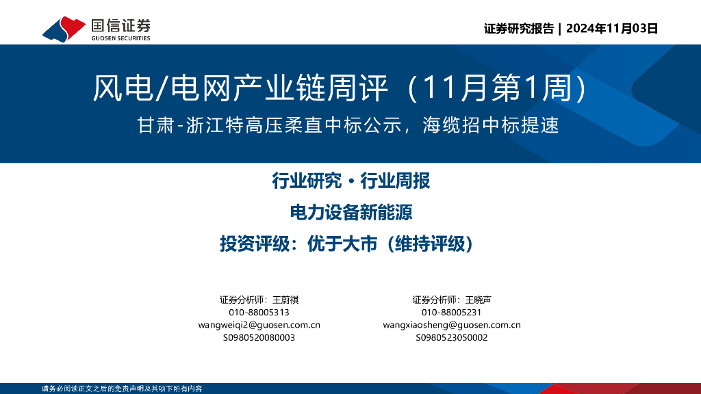 国信证券:风电/电网产业链周评(11月第1周):甘肃-浙江特高压柔直中标公示,海缆招中标提速.pdf