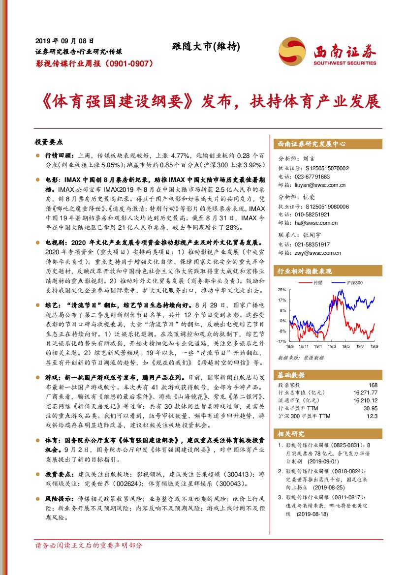 西南证券:影视传媒行业周报:《体育强国建设纲要》发布,扶持体育产业发展.pdf